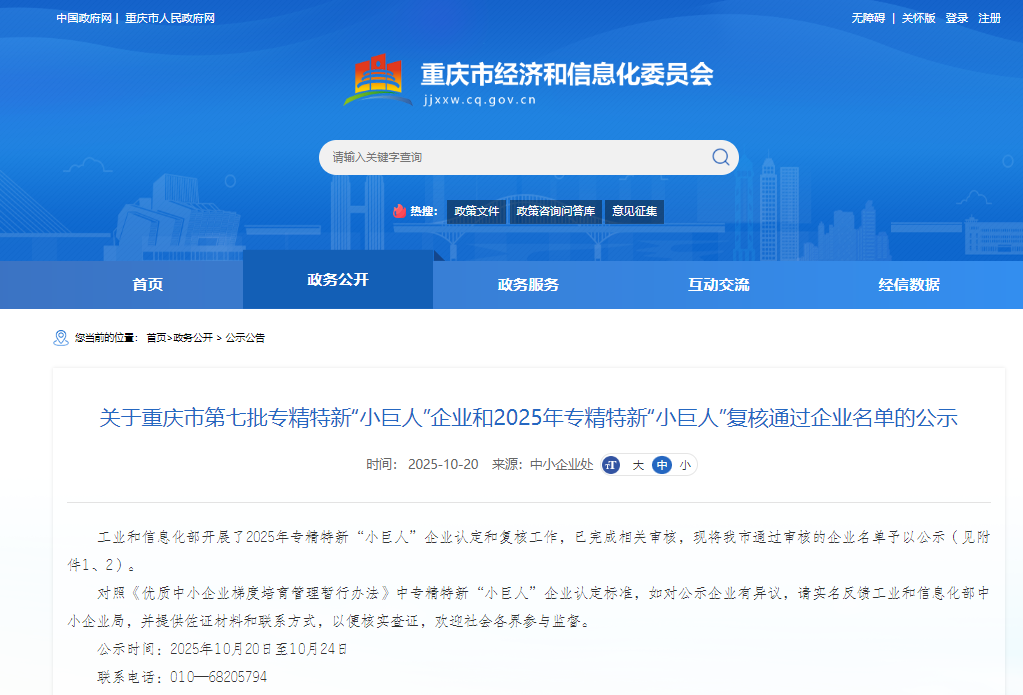 10月20日,市经信委发布第七批专精特新“小巨人”企业和2025年专精特新“小巨人”复核通过企业公示名单,重庆新增44家企业,复核通过130家企业。