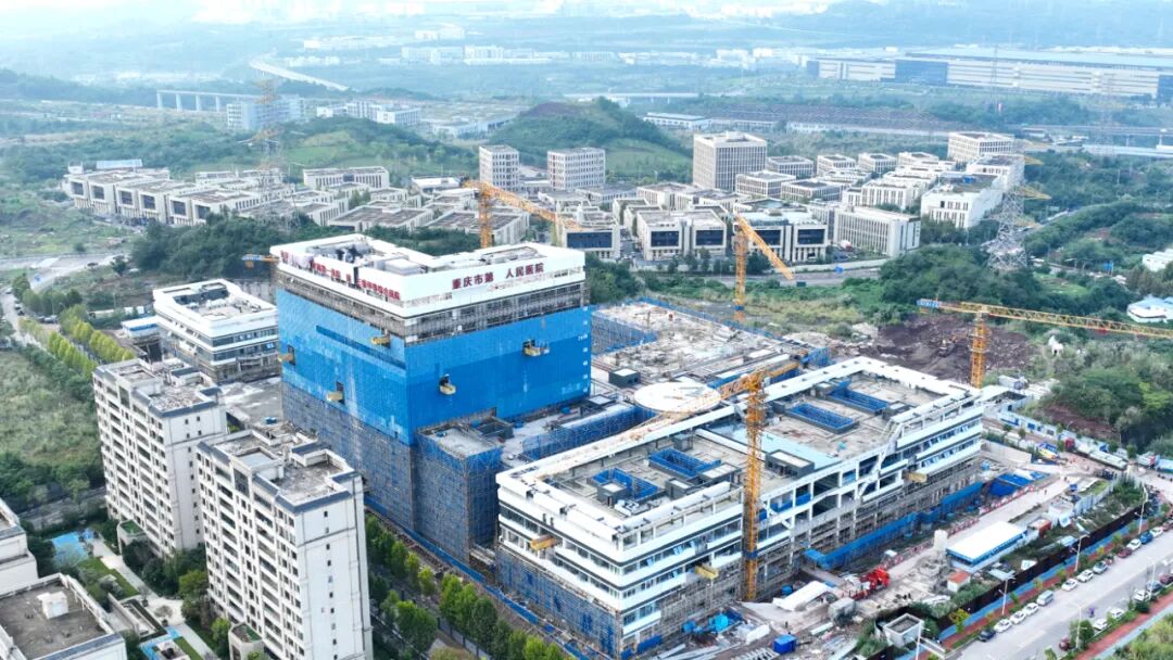 近日,走进位于两江新区水土新城的市六院(重庆医药高等专科学校附属第一医院、市职防院)北部院区一期工程项目建设现场,医院建筑群外立面幕墙铺设大半,现场4座塔吊来回忙碌工人们分布在各个点位有条不紊地进行作业。据悉,目前该项目已完成建设总进度的60%,预计一期项目将于2026年底投入使用。